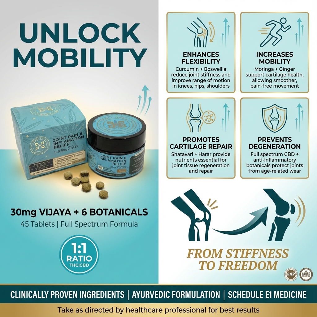 Joint Pain Relief is a 1:1 CBD:THC Ayurvedic tablet formulated to restore what inflammation drains, your mobility, joint comfort, and active lifestyle. Each tablet combines full spectrum Vijaya with powerful botanicals like Shallaki and Turmeric to combat stiffness from the inside out. AYUSH certified and GMP manufactured.