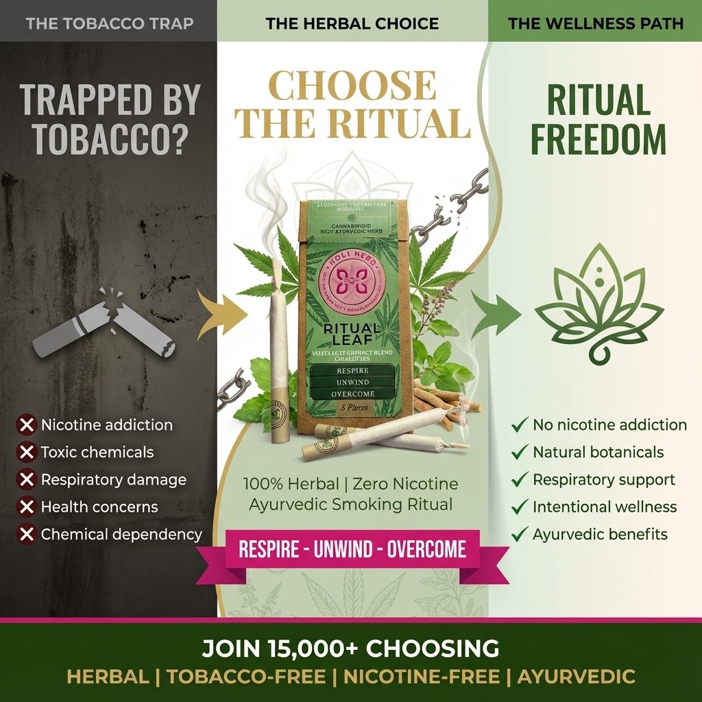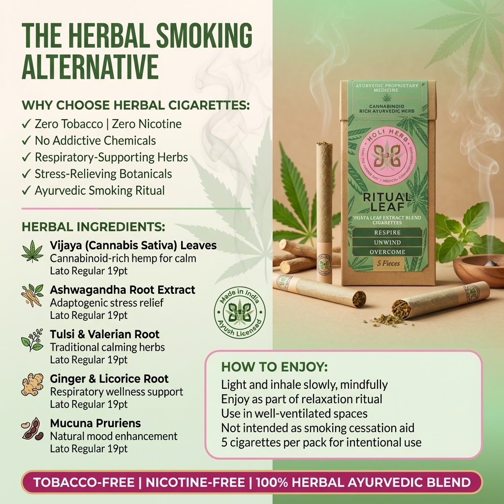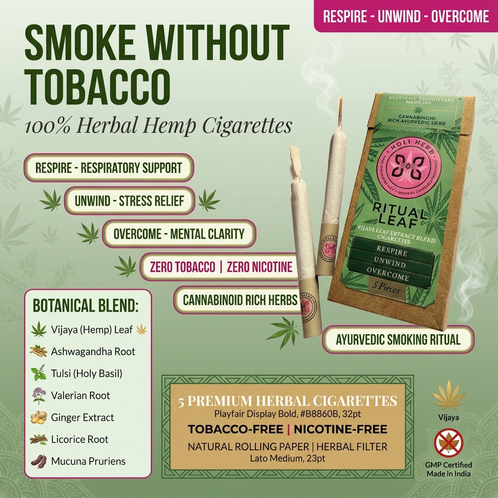 The Heart of Each Cigarette A masterfully balanced blend of 50mg Full Spectrum Hemp Extract (Cannabis Sativa L.) with a 1:1 THC:CBD ratio, enriched by a sacred gathering of Ayurvedic herbs—Tulsi, Mulethi, and Vasaka—traditionally revered for their respiratory grace.
