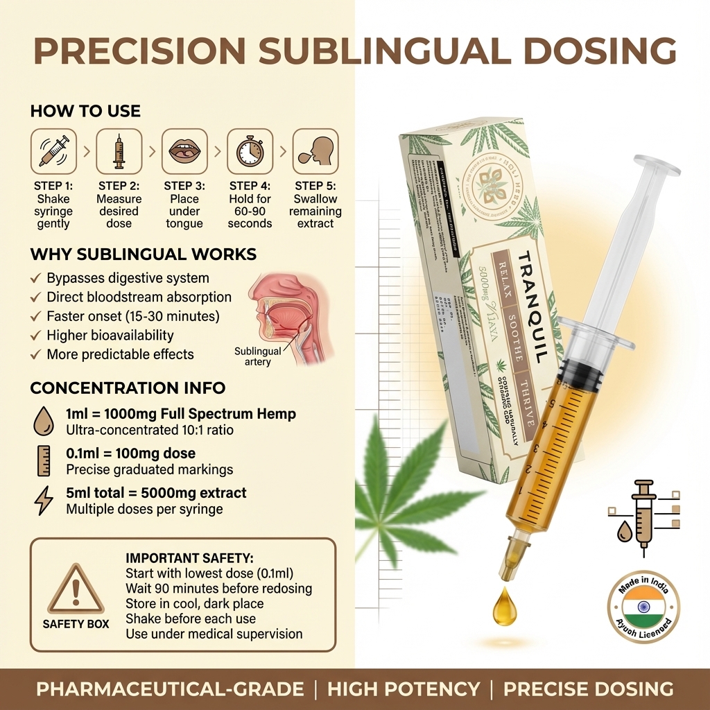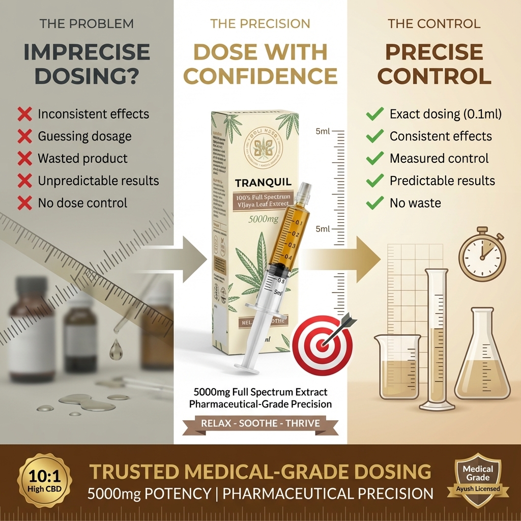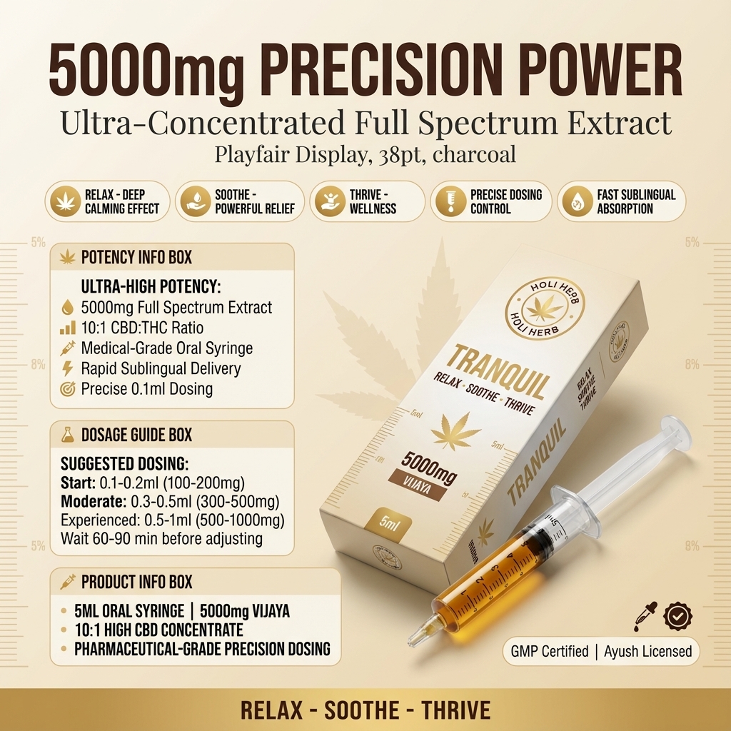 The Heart of Each Syringe A profound concentration of 5000mg Full Spectrum Vijaya Extract (Cannabis Sativa L.), presenting a naturally balanced 1:1 ratio of THC and CBD. This pure distillation is enriched with a tapestry of sacred, time-honored Ayurvedic botanicals, harmonizing ancient botanical intelligence with modern clinical precision.